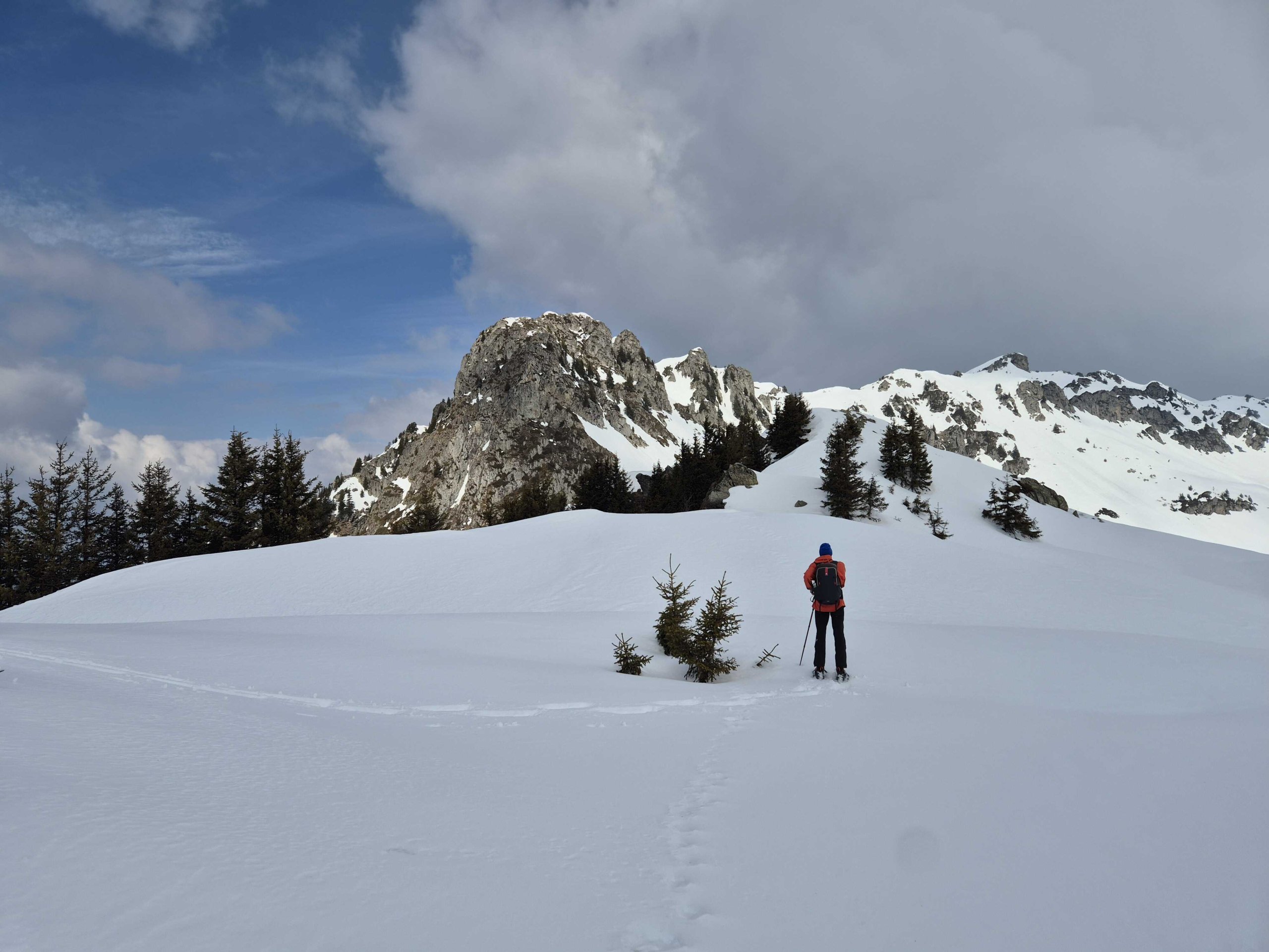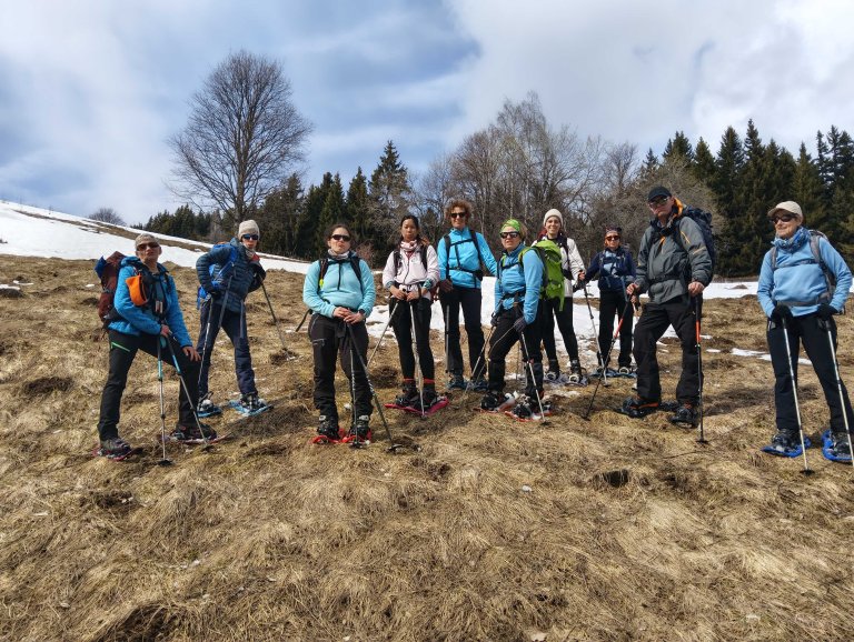 Une sortie variée alternant des passages en forêt, de belles prairies enneigées et une raide crête pour terminer. Sans neige au départ, les raquettes ont ensuite été bien utiles pour atteindre l'antécime sud du Grand Mas. Une descente en glissade pour rendre le tout plus ludique et un groupe heureux !