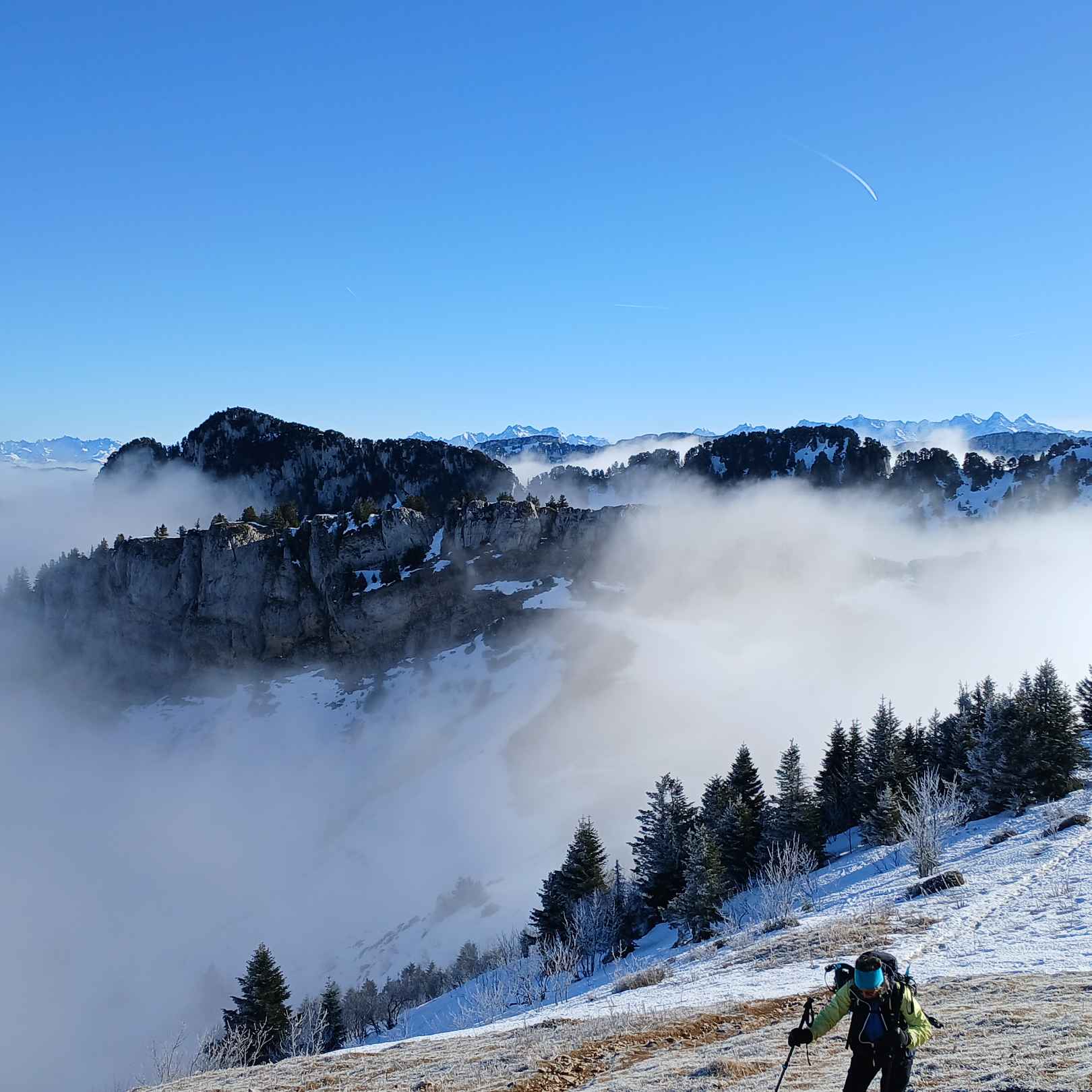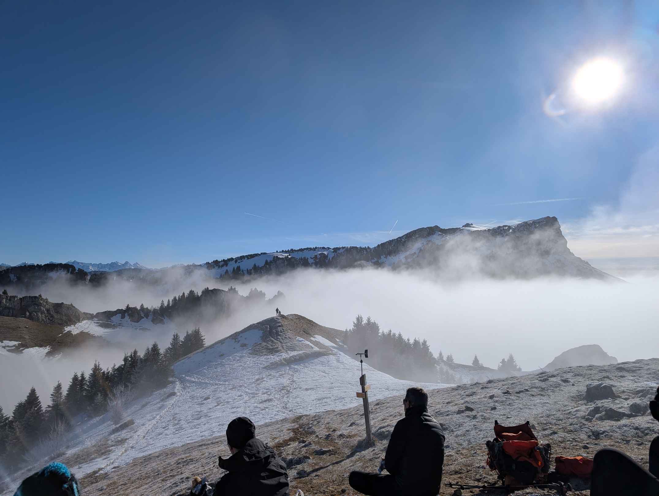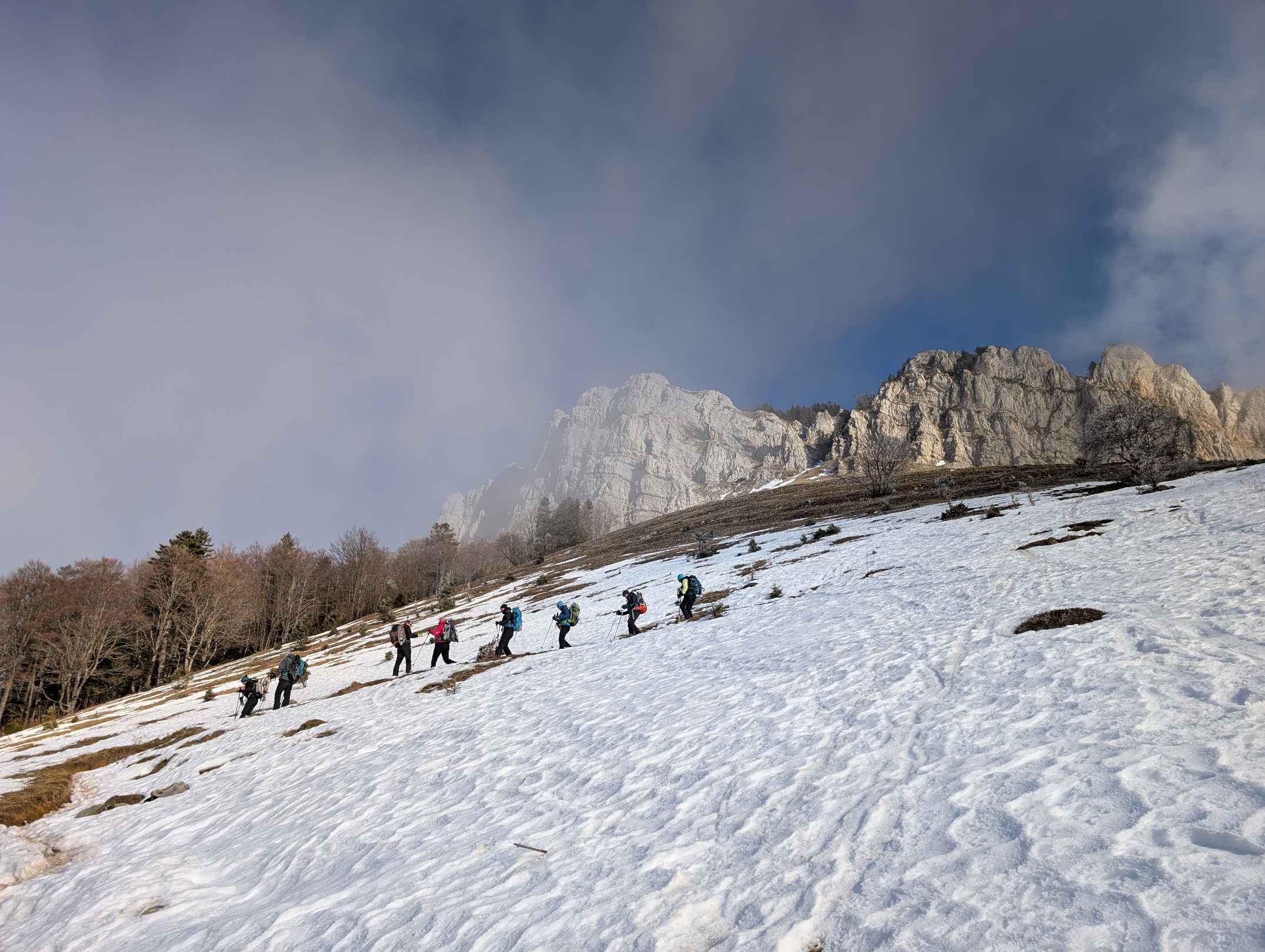 Belle sortie raquette pour démarrer 2026 avec le sommet du Petit Som en boucle depuis le Ruchère. Montée par le versant nord dans une neige bien dure nécessitant raquettes puis crampons (remarquez l'encadrement au petit soin pour aider les participants !) et descente versant sud par le Pas du Loup (complétement sec) et le Col de la Ruchère. Très belle vue au sommet au dessus des nuages et une surprise avec un superbe cercle de brocken et sa gloire (on en profite pour faire un petit cours d'optique avant la pause déjeuner). Une alternance de paysage agréable mais on espère le retour de la neige fraîche rapidement pour continuer la saison. A bientôt pour les prochaines sorties avec le club !